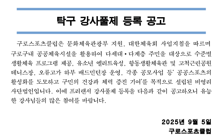 2025년 9월 구로스포츠클럽 탁구 강사풀제 모집 공고