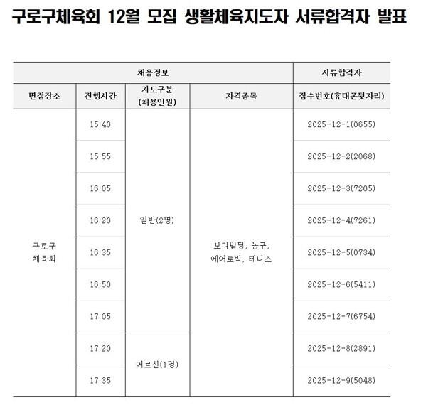 구로구체육회 12월 모집 생활체육지도자 서류합격자 발표
