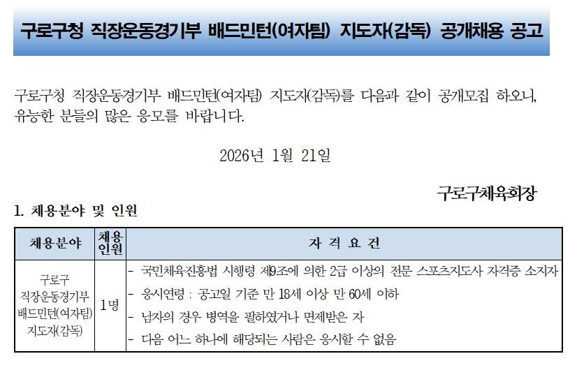 구로구청 직장운동경기부 배드민턴(여자팀) 지도자(감독) 공개채용 공고