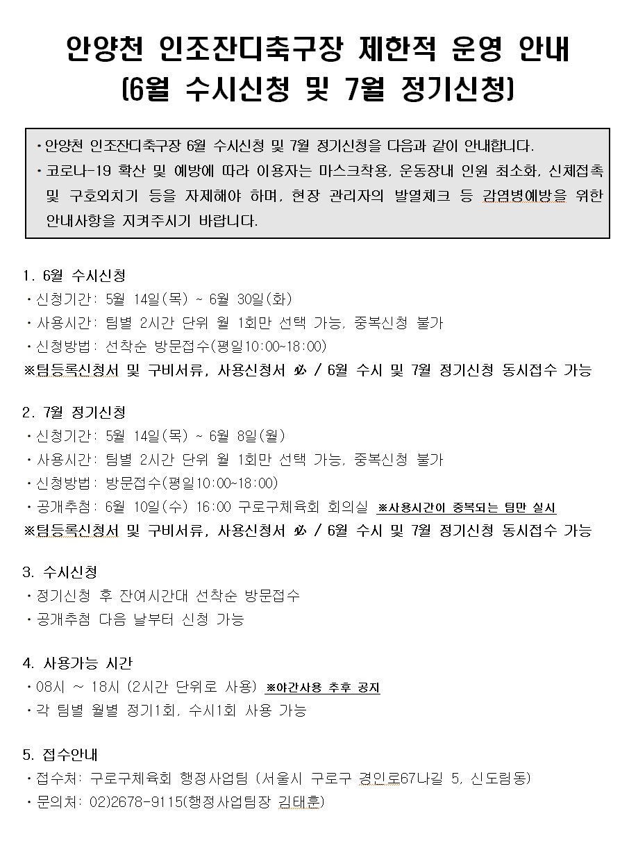 (6월 수시 및 7월 정기신청)안양천 인조잔디축구장 제한적 운영 안내