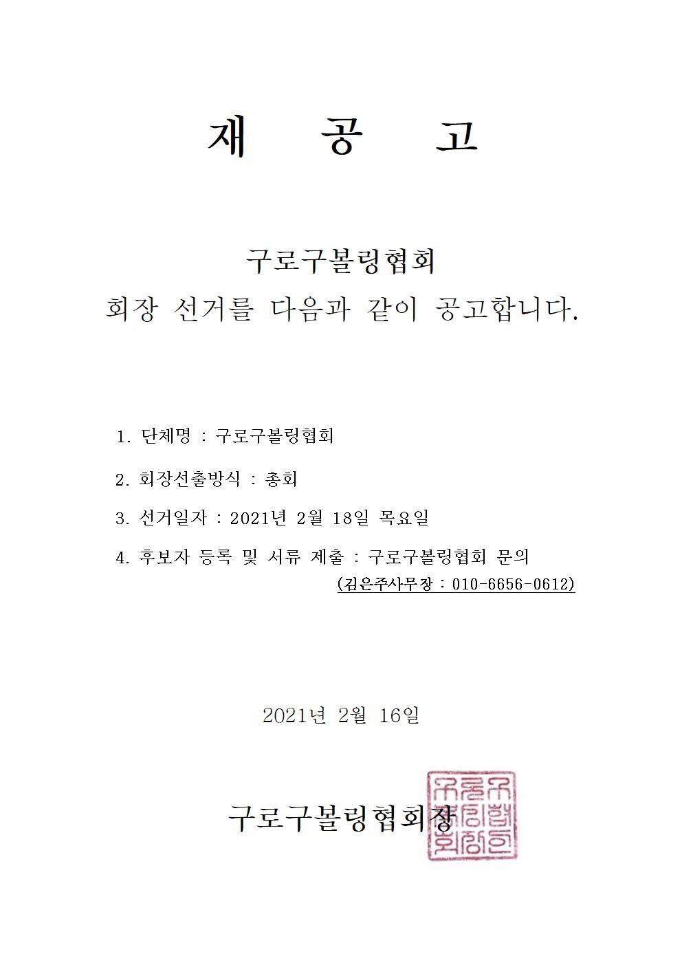 구로구볼링협회 회장 선거 재공고