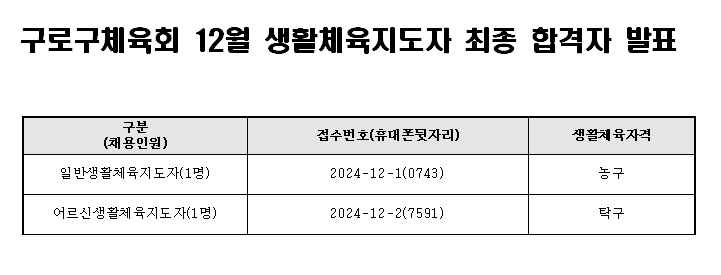 구로구체육회 12월 생활체육지도자 최종 합격자 발표