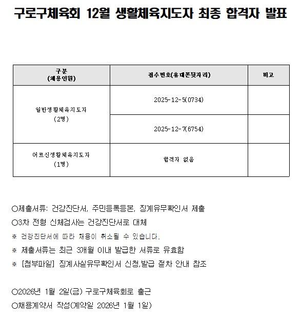구로구체육회 12월 생활체육지도자 최종 합격자 발표