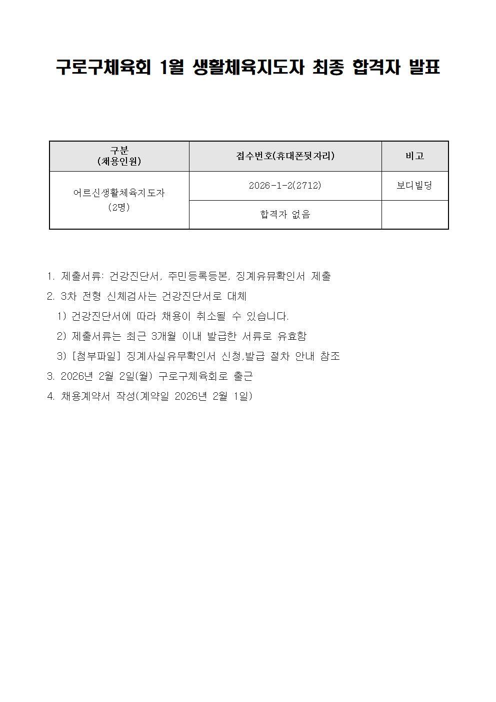 구로구체육회 1월 생활체육지도자 최종 합격자 발표